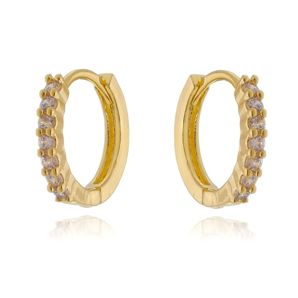 O brinco argola zircônia folheado em Ouro 18k reflete um brilho único com sua cravação das zircônias serem micros o que o faz uma joia belíssima.