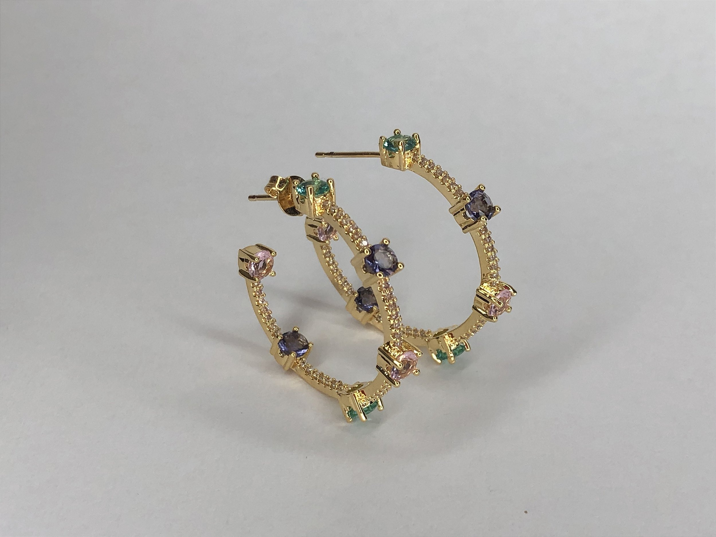 A Argola cravejada folheada em Ouro 18k reflete um brilho único com sua cravação das zircônias micros e também zircônias pntos de luz coloridos o que a faz uma joia belíssima.