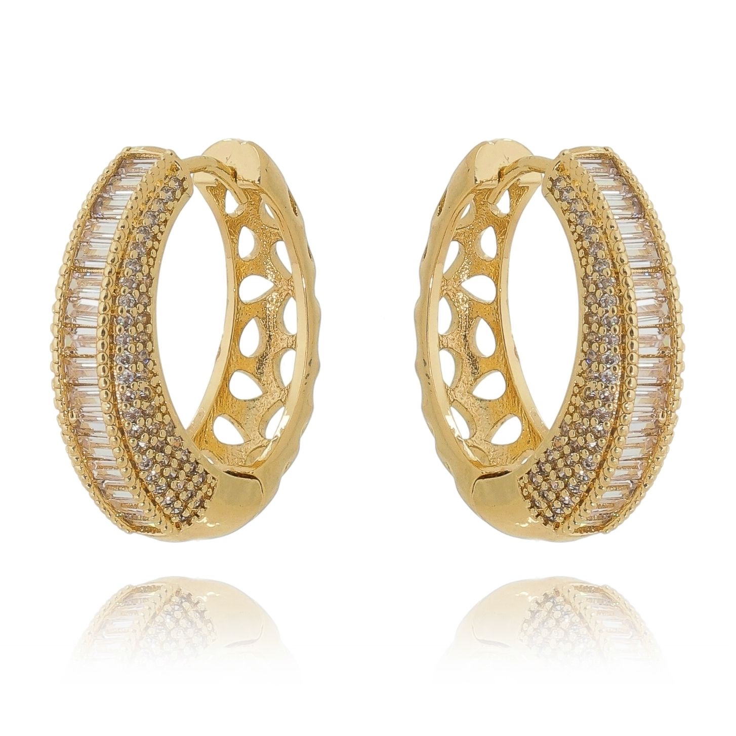 A Argola cravejada folheada em Ouro 18k reflete um brilho único com sua cravação das zircônias micros e também zircônias navetes o que a faz uma joia belíssima.