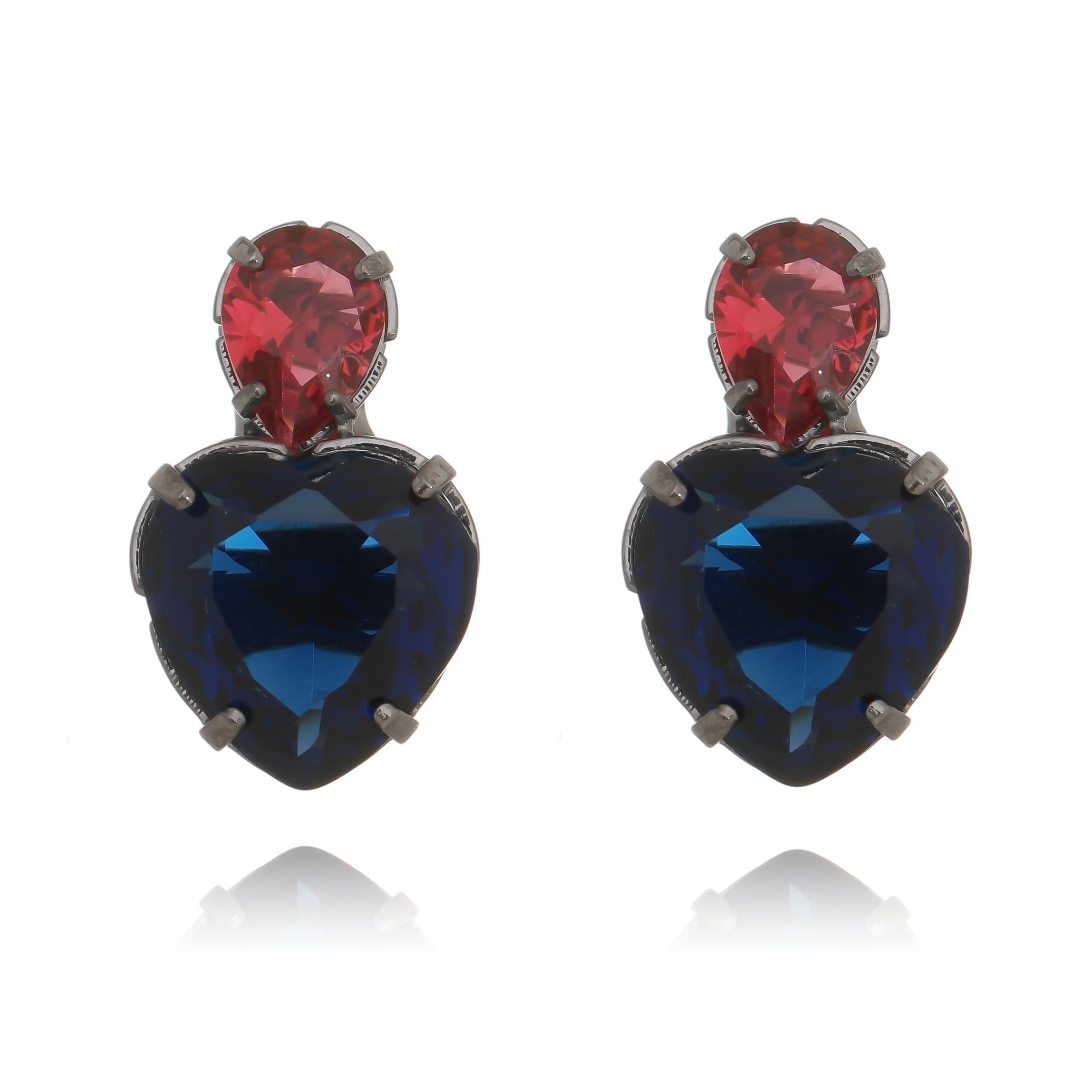 Esse brinco é uma peça para você usar no seu dia a dia e também em ocasiões especiais. Brinco show para todas as horas. Brinco coração com pedra Azul e Rubi, um brinco para você amar. Esse modelo de coração traz a beleza e brilho da zircônia e é a grande tendência da estação e o queridinho das mulheres.