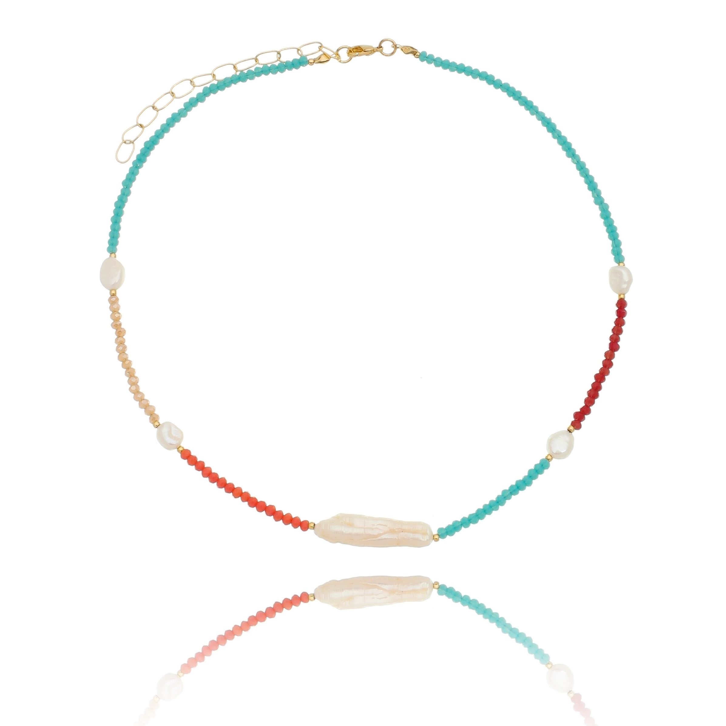 A choker colorida é feita com cristais em cores variadas, recebe também pérolas barrocas e elementos com banho de ouro 18k. Tem um comprimento de 37 cm e mais o extensor de 6 cm.