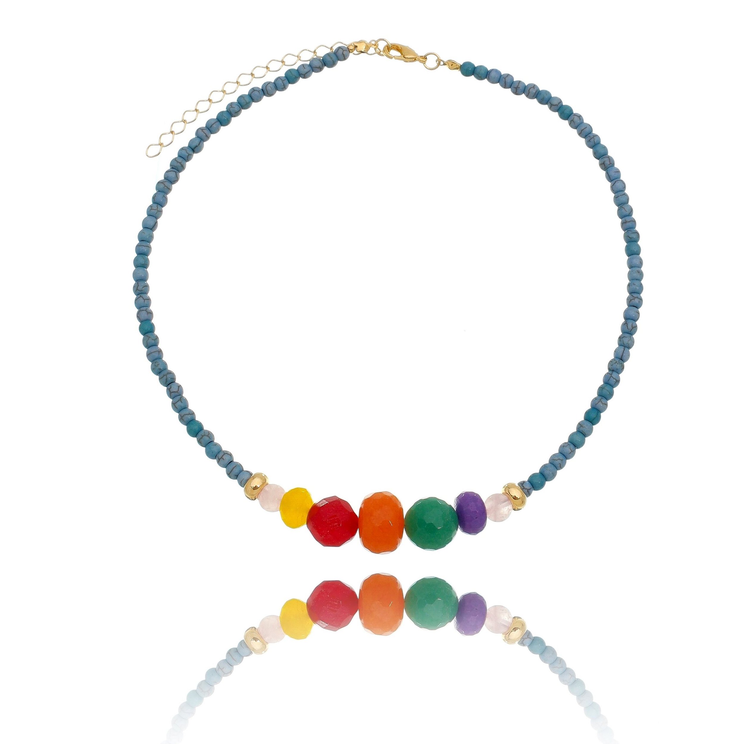 A choker colorida é feita com contas turquesa na maior parte do comprimento, recebe também pedras naturais coloridas facetadas e elementos com banho de ouro 18k. Tem um comprimento de 37 cm e mais o extensor de 6 cm.
