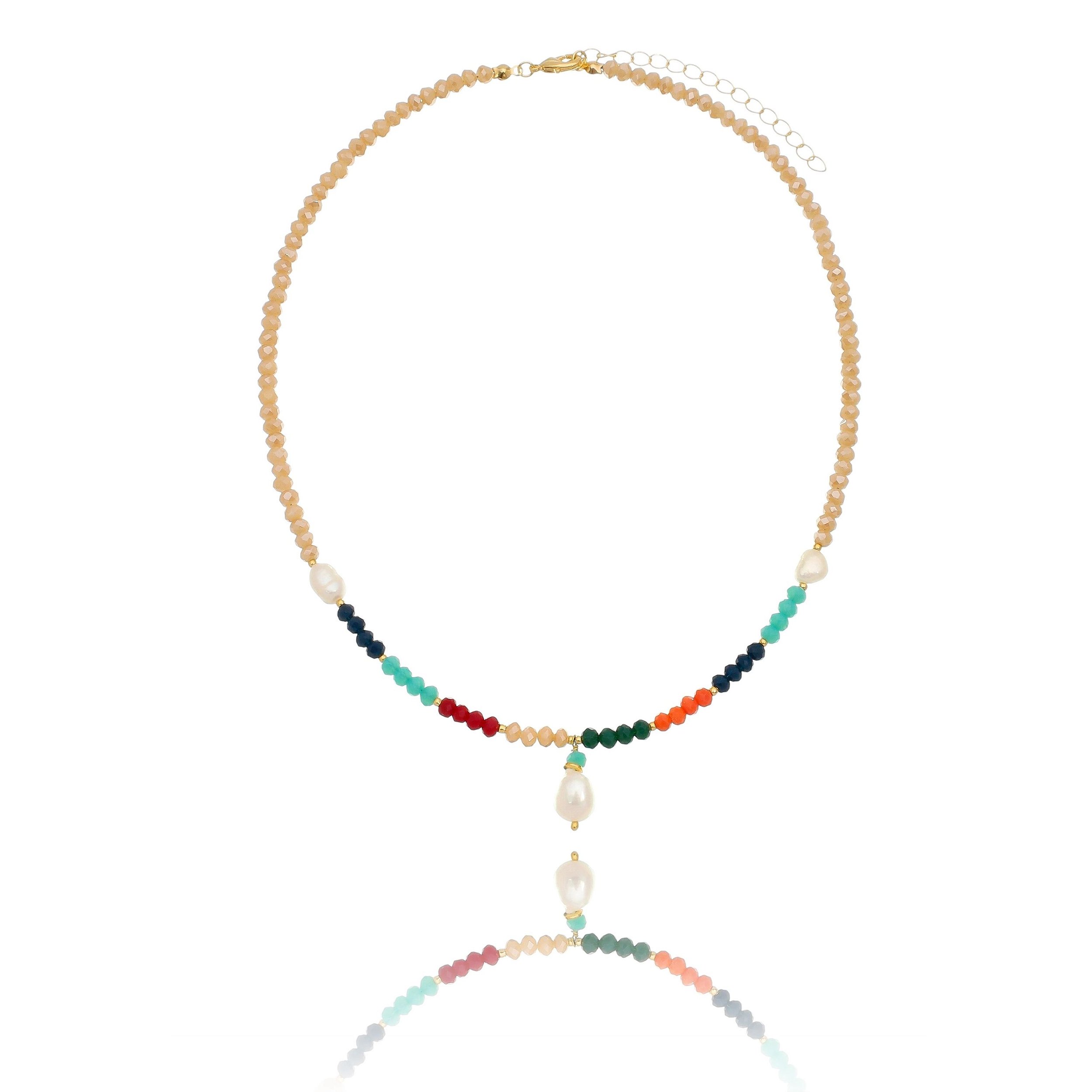 O colar de pedras coloridas e pérolas faz parte da nossa coleção de gargantilhas delicadas, um estilo muito usado no verão. A mistura das cores e das pedras traz uma beleza única para a peça que valoriza o visual da mulher. Ela faz com que o colo e pescoço ganhe um destaque alegrando o look escolhido.