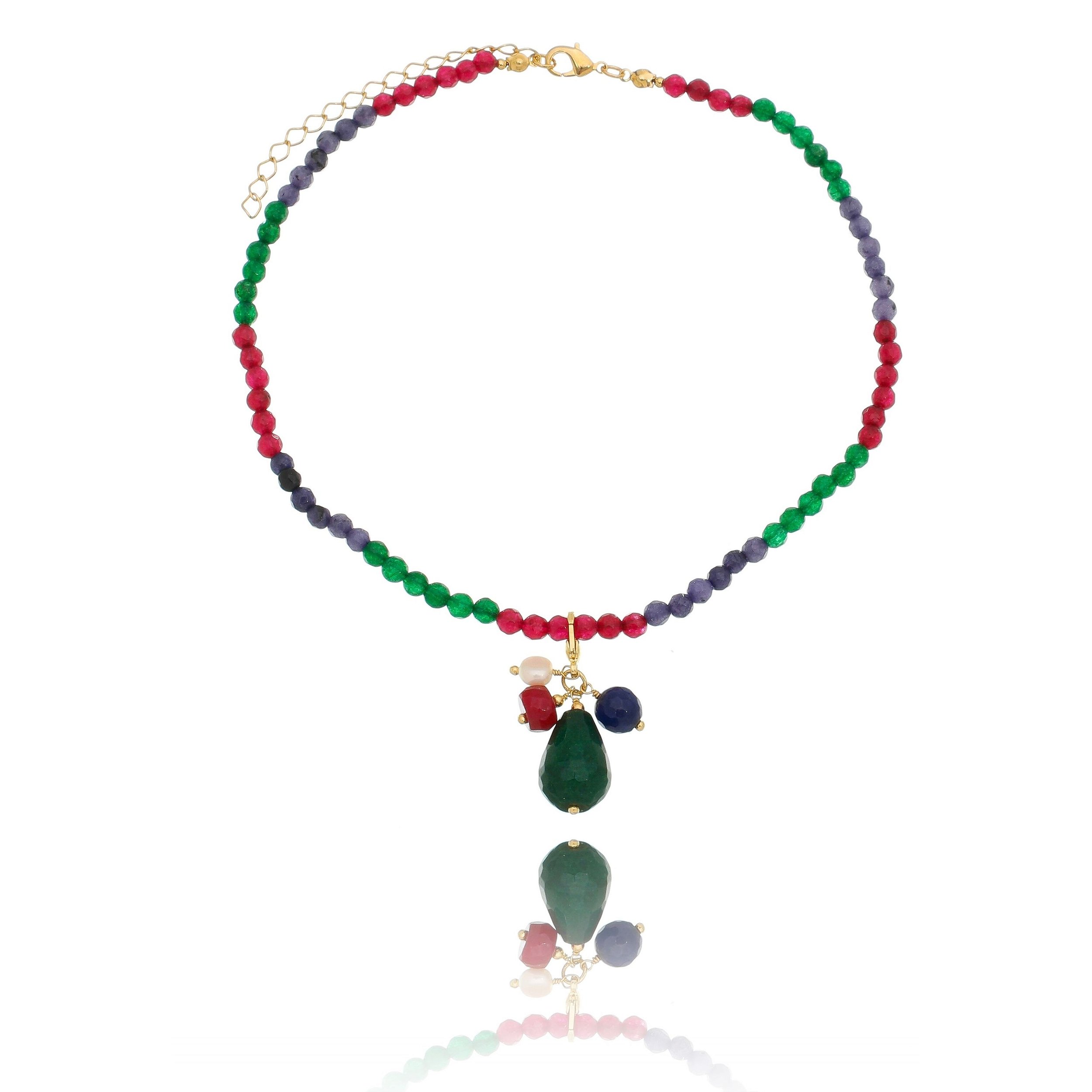 A choker pedras é feita com pedras naturais em cores variadas, recebe também um pingente com uma perola shell e outras pedrinhas, sem contar na finalizações dos metais com banho de ouro 18k. Tem um comprimento de 33 cm e mais o extensor de 7 cm.