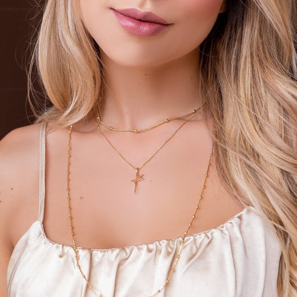 O trio de colares é composto por uma choker ou gargantilha na malha da corrente rabo de rato com bolinhas, um charme a parte; um colar com pingente caligráfico fé em forma de cruz na corrente veneziana e um colar longo de bolinhas na malha veneziana. Essa combinação de colares ficou realmente perfeita, pois combinamos as formas geométricas e texturas diferentes das correntes que compõe o trio.