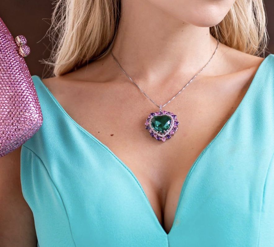 Colar com pingente de coração Turmalina e também acompanha brinco de coração folheado em ródio branco.