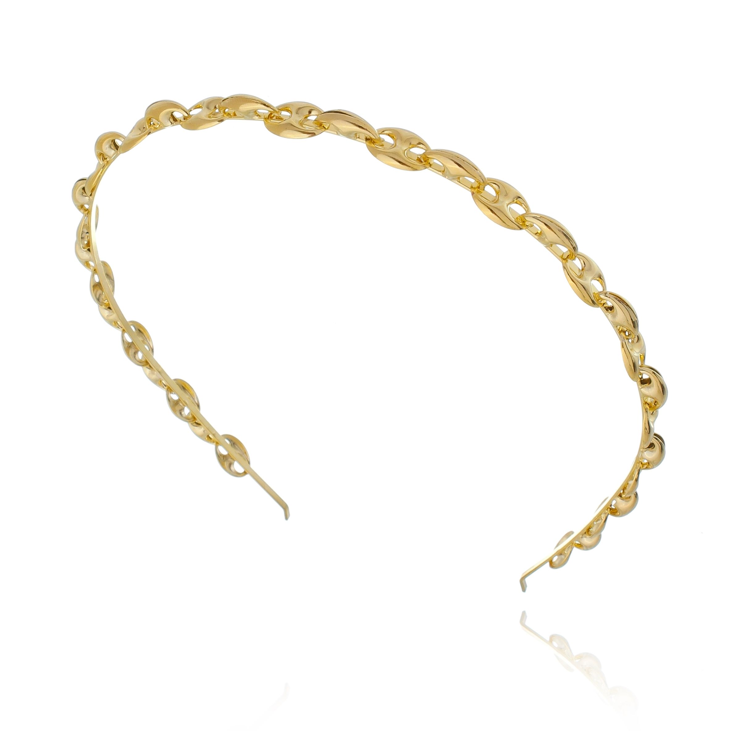 Nossa tiara para cabelo dourada ou tiara de metal é feita com corrente cartier e um aro de metal.