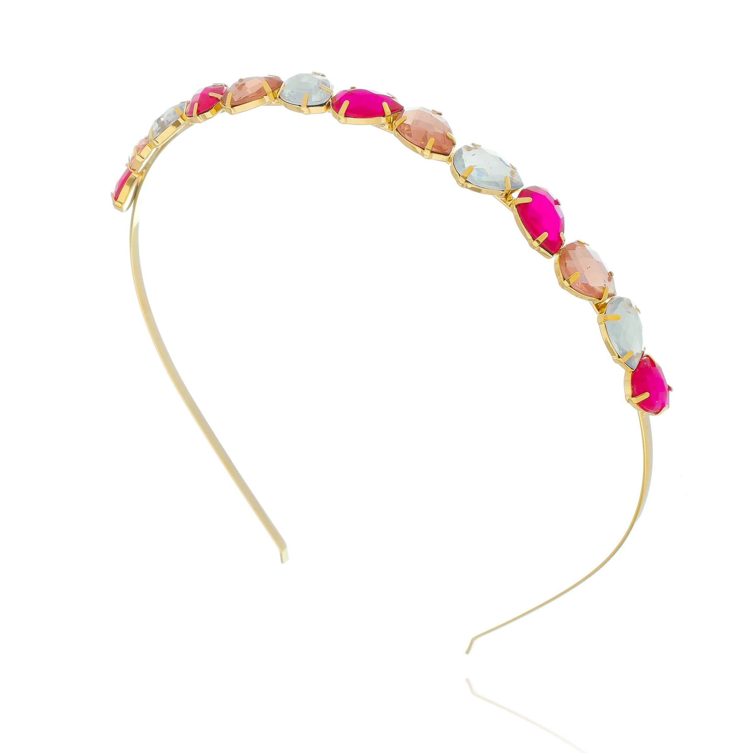 Esse modelinho traz gotinhas em tons lindissimos de fúcsia, cristal e morganita. Essa tiara vem acompanhada de um brinco gota na cor fúcsia para combinar com seu acessório de cabelo.
