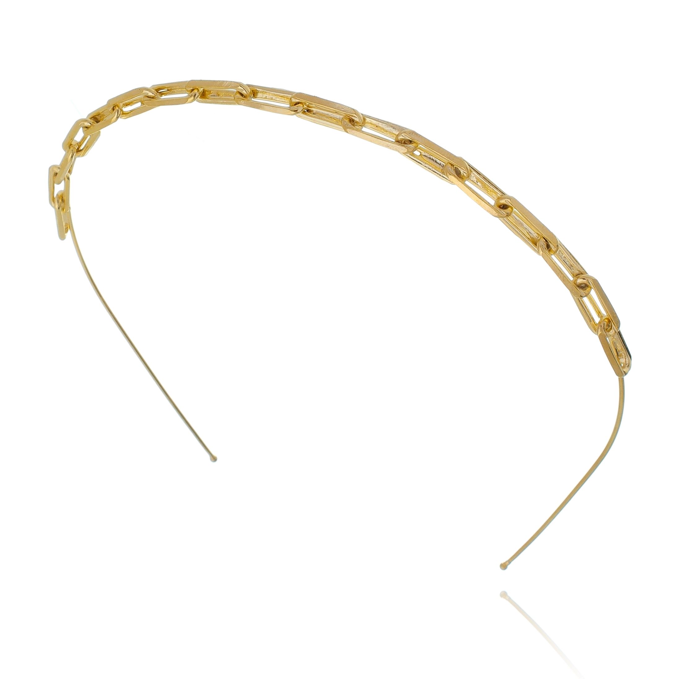 Nossa tiara para cabelo dourada ou tiara de metal é feita com corrente cartier e um aro de metal.