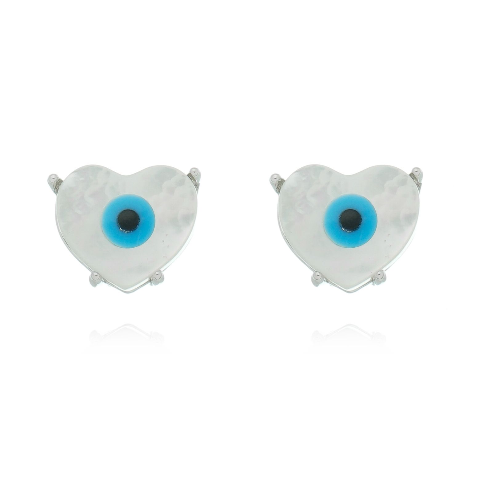 Brinco pequeno com o charme do olho grego em formato de coração na madrepérola.